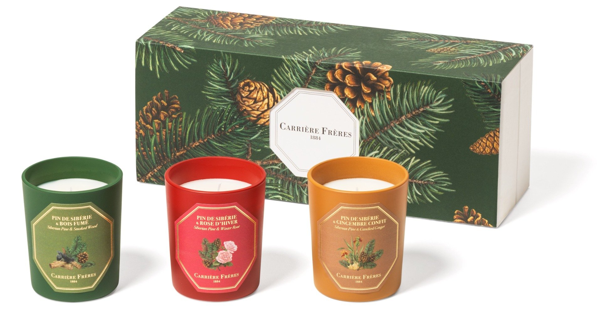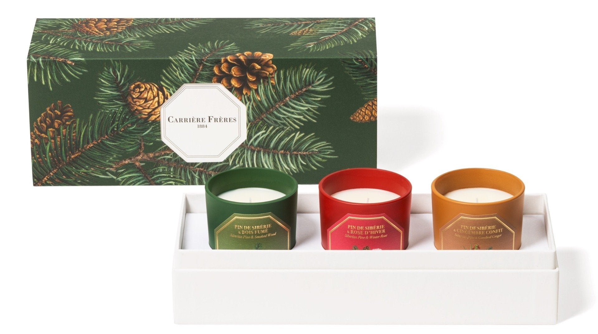 Carriere Freres Holiday Botanical Set: the Laos Benzoin Set composed of three small candles brings together three distinctive scents around the Laos benzoin; from earthy jungles rich with cacao beans to divine orchards of fresh roses and endless Siberian forests, the trio is altogether floral, woody, gourmet and resinous. It calls for oriental refinement, hedonist moments and joyful fireplaces. Set contains 3 x 2.5 oz candles.