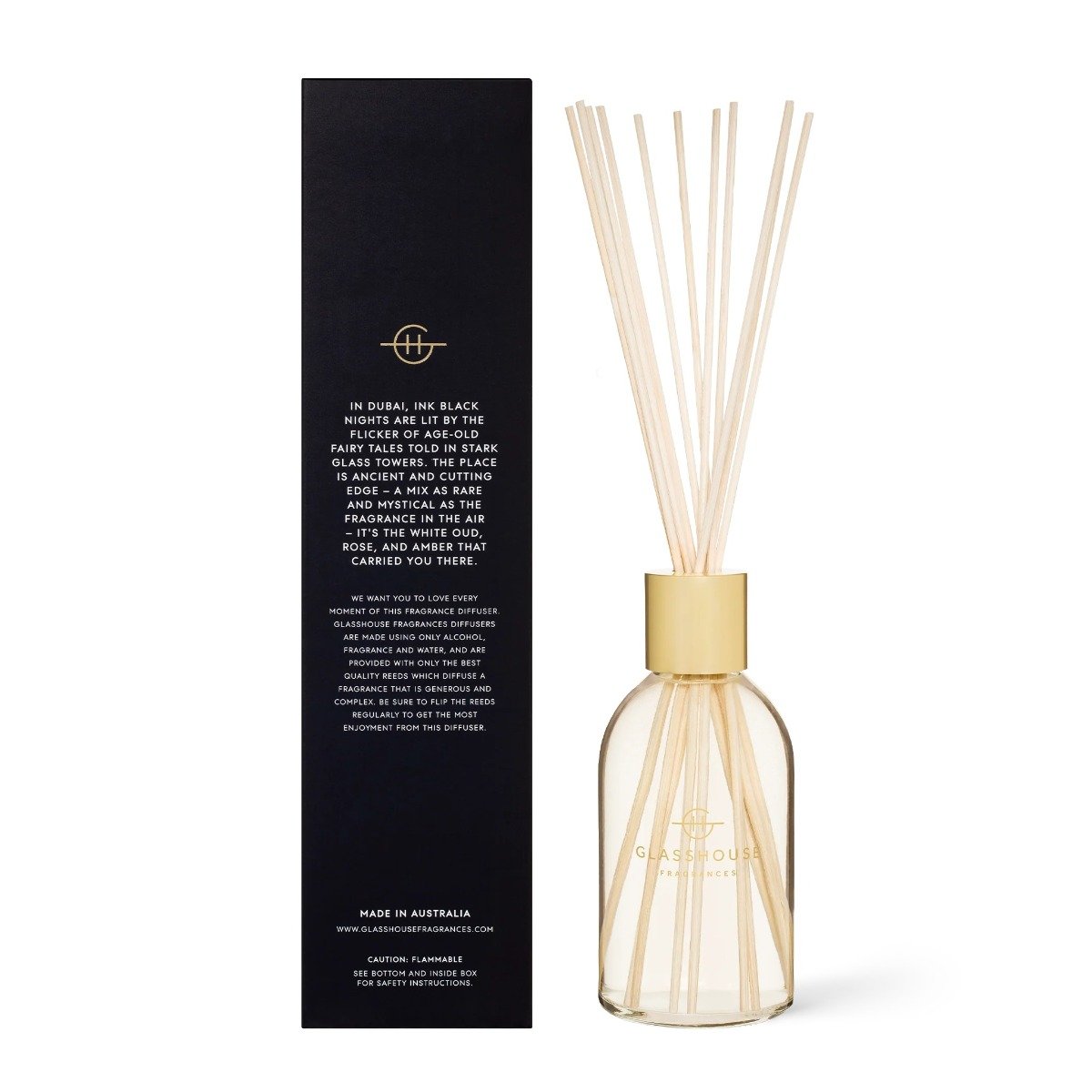 Glasshouse Arabian Nights Diffuser: Like a stroll through Dubai’s perfume souk at dusk, it’s rich with saffron and white oud. A transcendent everyday luxury, it creates instant ambience.