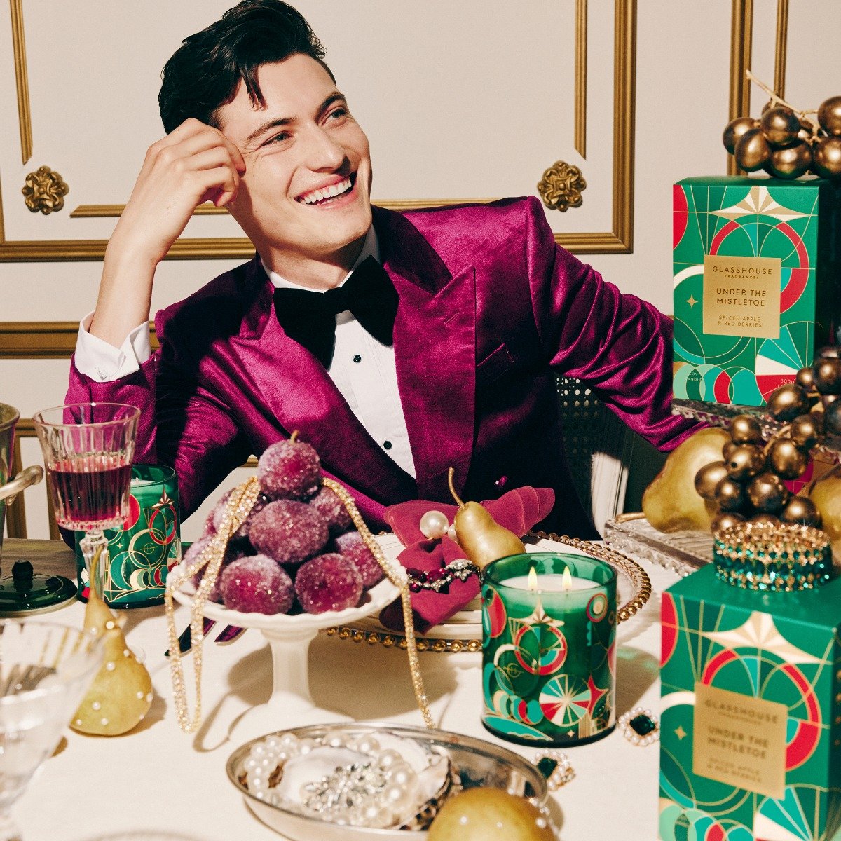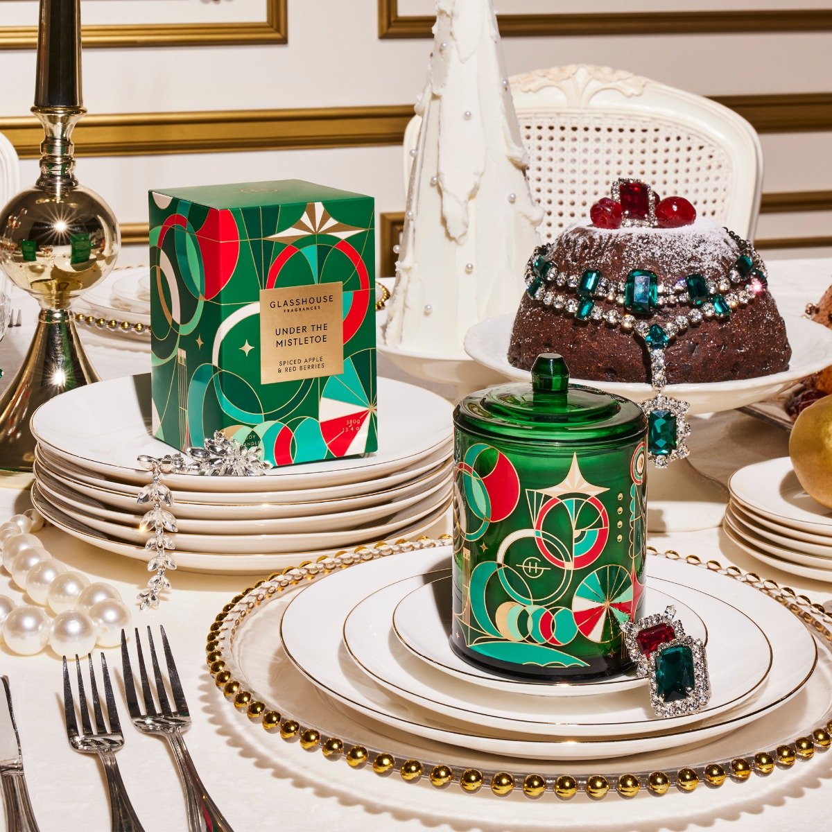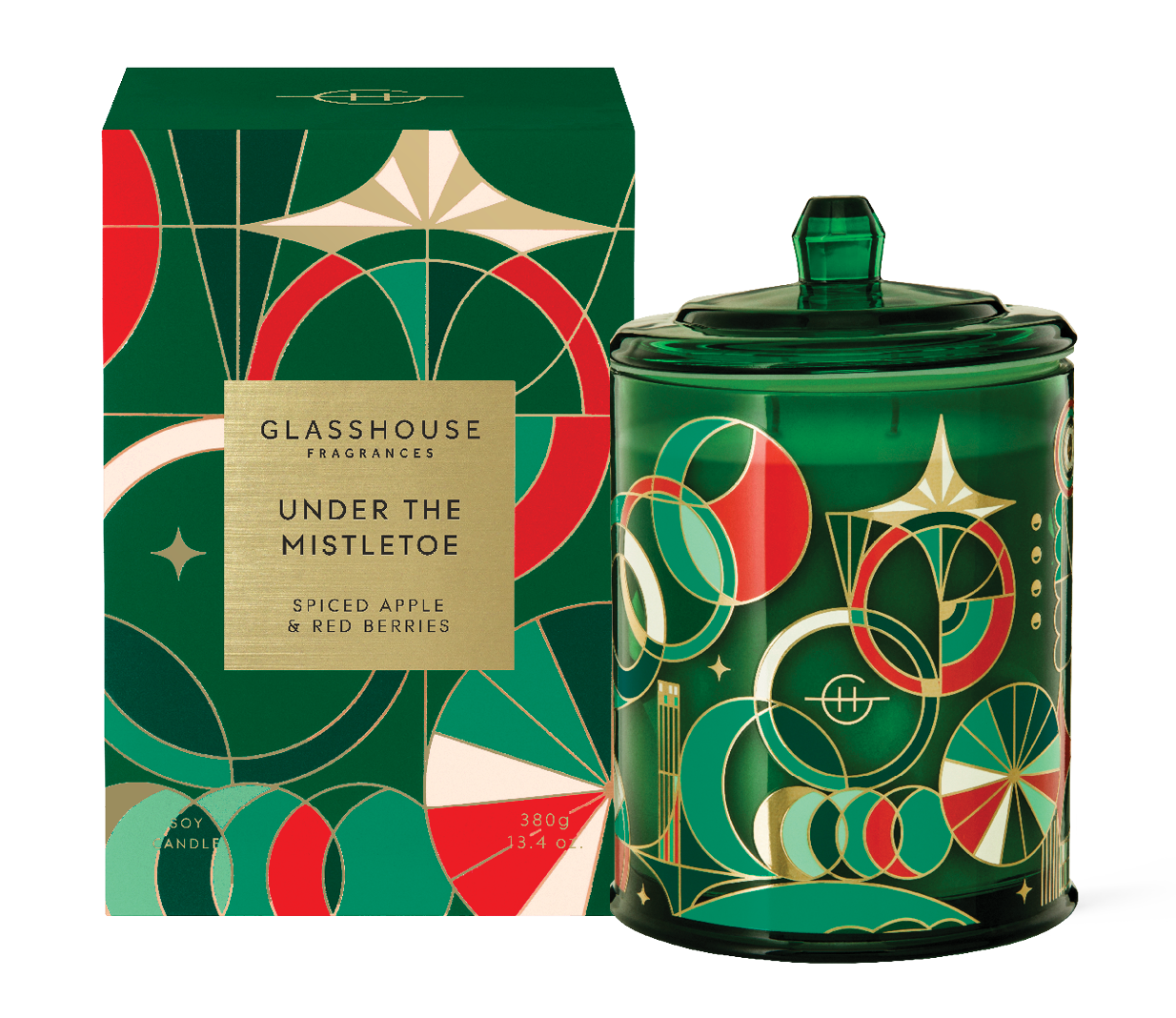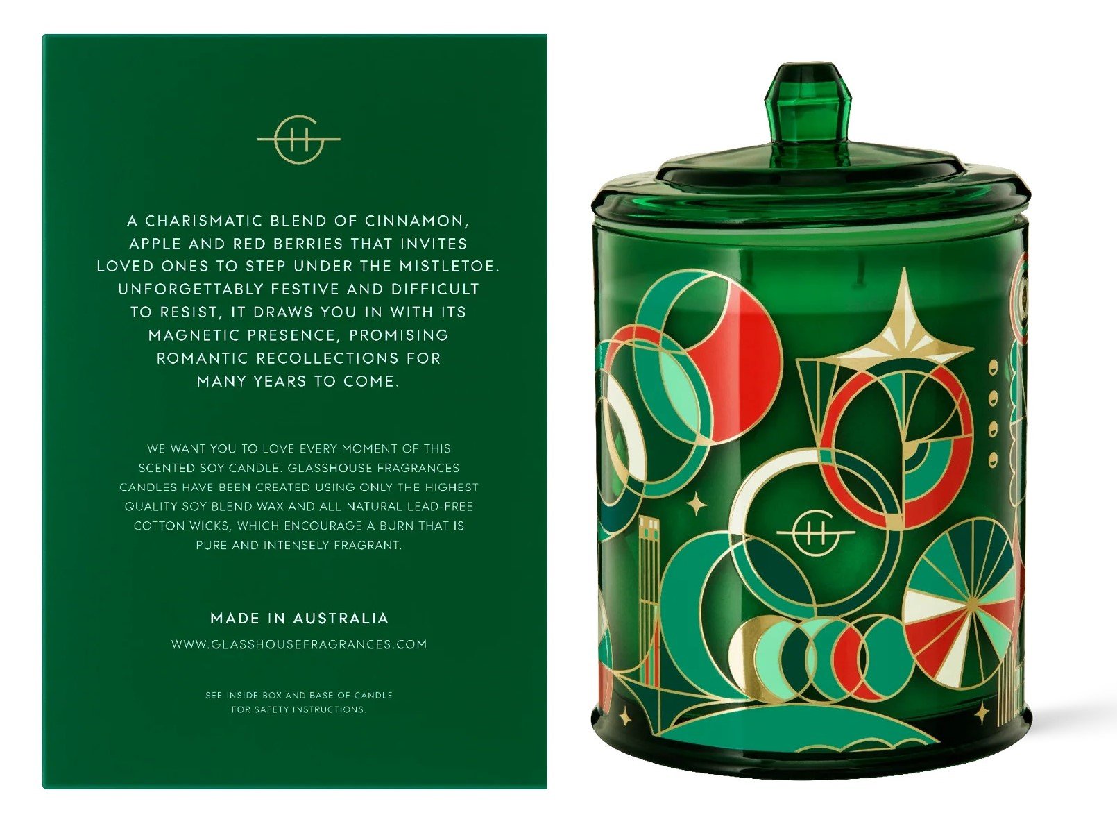 Glasshouse Under The Mistletoe Candle (Limited Edition): Spiced Apple & Red Berries. A charismatic blend of cinnamon, apple and red berries that invites loved ones to step under the mistletoe. Unforgettably festive and difficult to resist, it draws you in with its magnetic presence, promising romantic recollections for many years to come. A signature blend of Spiced Apple and Red Berries. As difficult to resist as a Christmas kiss. Top Notes: Orange, Mandarin. Middle Notes: Apple, Red Berries, Cinnamon, Clove Bud. Base Notes: Vanilla, Sweet Caramel.