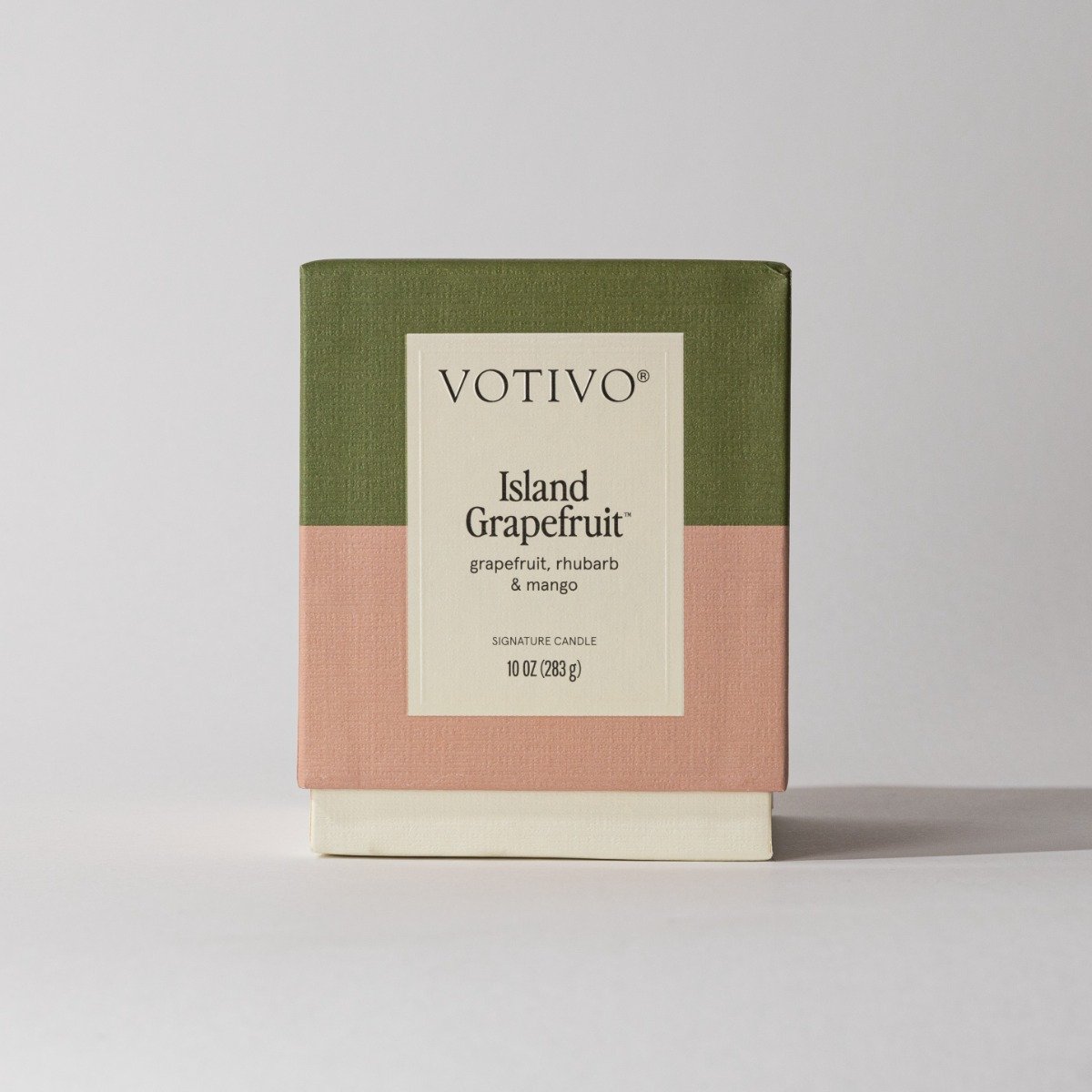 Votive Island Grapefruit Signature 10oz Candle: Smells like tropical citrus and fruity florals. Feels like adventuring under lush palms as ocean waves crash in the distance. Top Notes: Red Grapefruit, Pink Grapefruit. Middle Notes: Fruity Florals. Base Notes: Caramel, Musk.