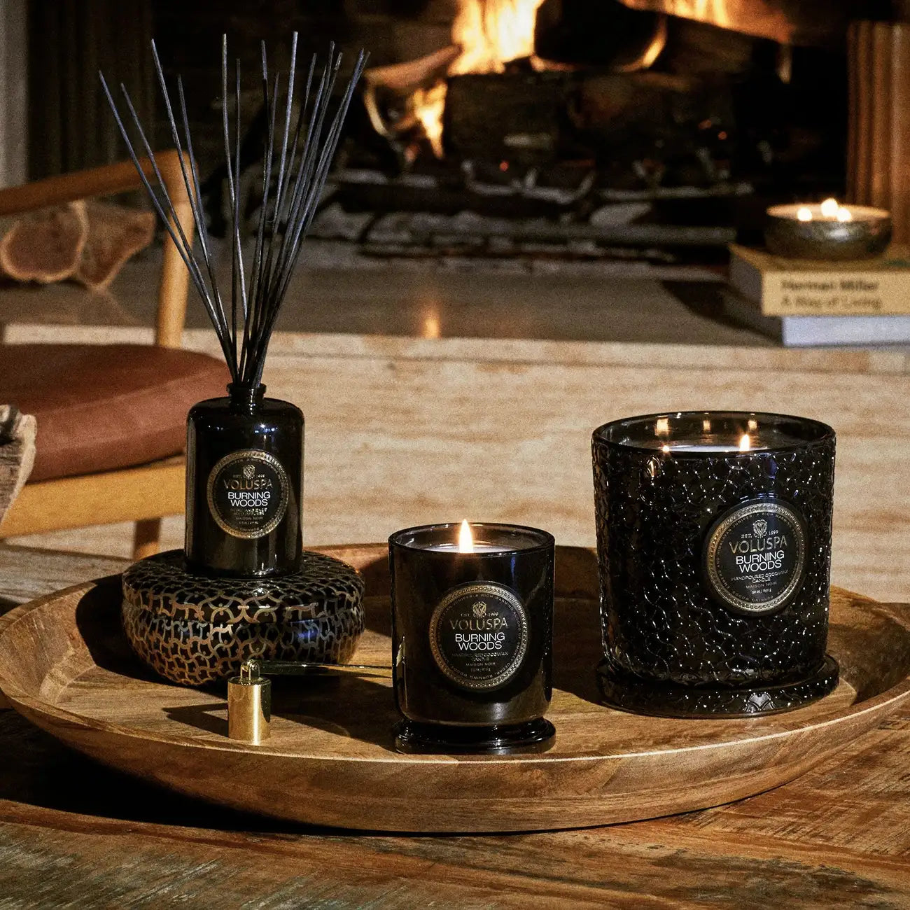 Indulge in the alluring charm of Voluspa's Maison Noir Collection, where rich fragrances blend effortlessly with artistic design. Carefully crafted using Voluspa's proprietary coconut wax, each candle offers an exceptionally clean burn and vibrant scent release. Presented in intricately designed vessels, these candles and diffusers seamlessly combine visual beauty with sensory indulgence, bringing warmth, depth, and a touch of intrigue to any room. Maison Noir's fragrances embody an atmosphere of sophistication, ideal for transforming everyday spaces into welcoming environments with luxurious aromas.